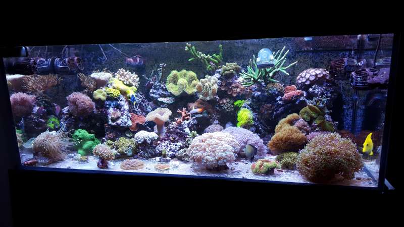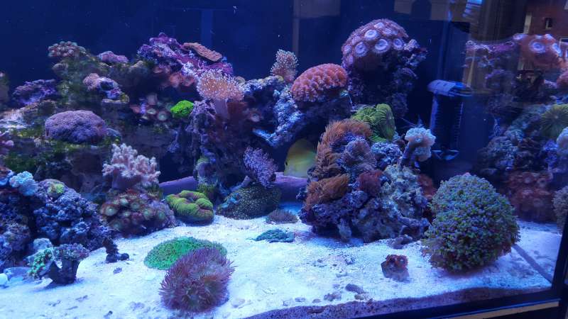 Akvariet er et 450liters Bima made med weisglas i alle 4 side 130*70*50cm med trekantet overløb i højre hjørne og bølgebrydere.