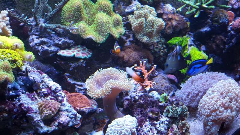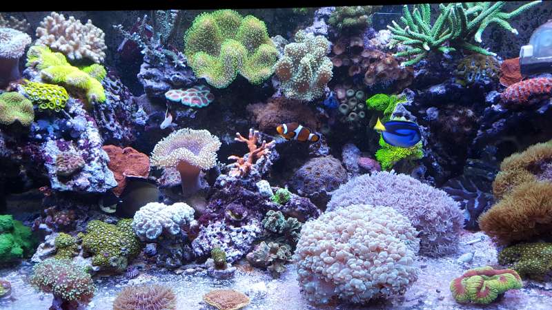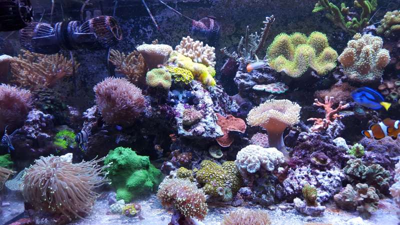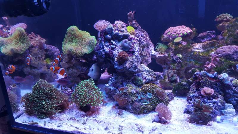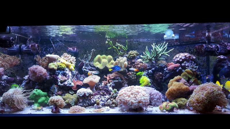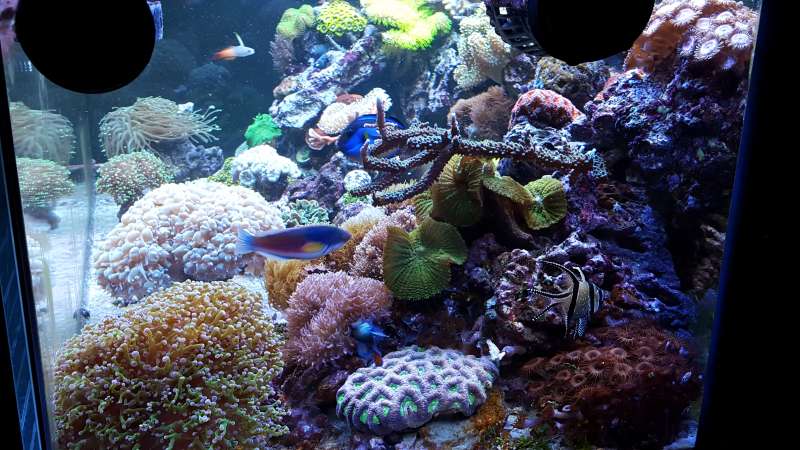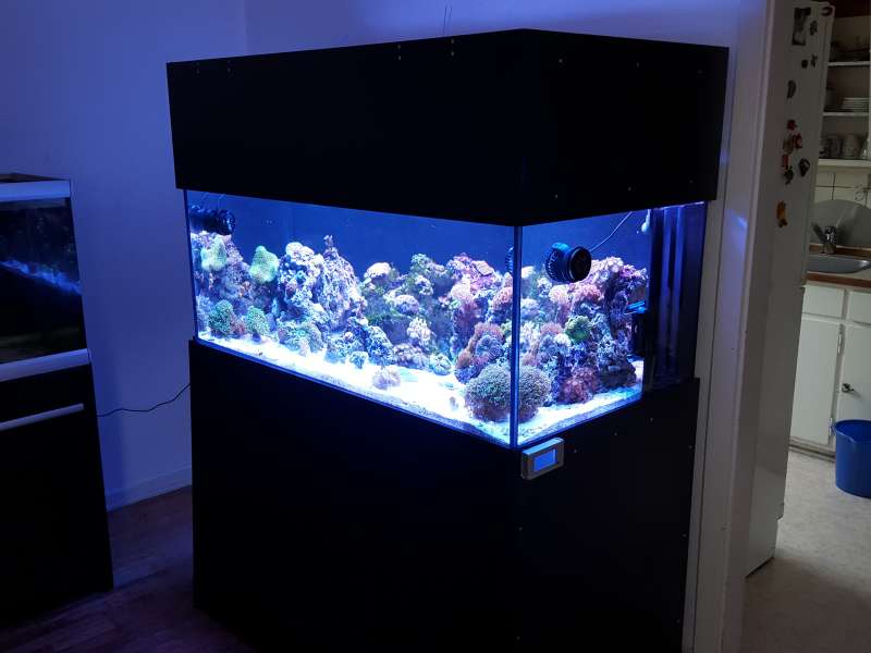 Akvariet er et 450liters Bima made med weisglas i alle 4 side 130*70*50cm med trekantet overløb i højre hjørne og bølgebrydere.