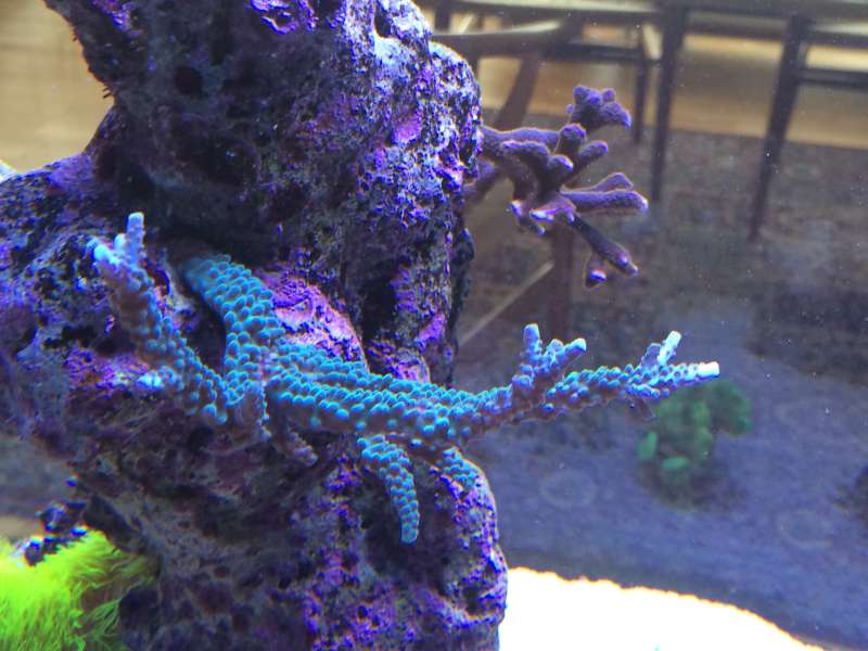 Der knækkede en gren af den lyseblå/grå monti ved transport, den er sat i den anden ende af baljen, et sted med mindre flow og lidt mindre lys, blir sjovt at se forskellen på de to med tiden. ( den til venstre)