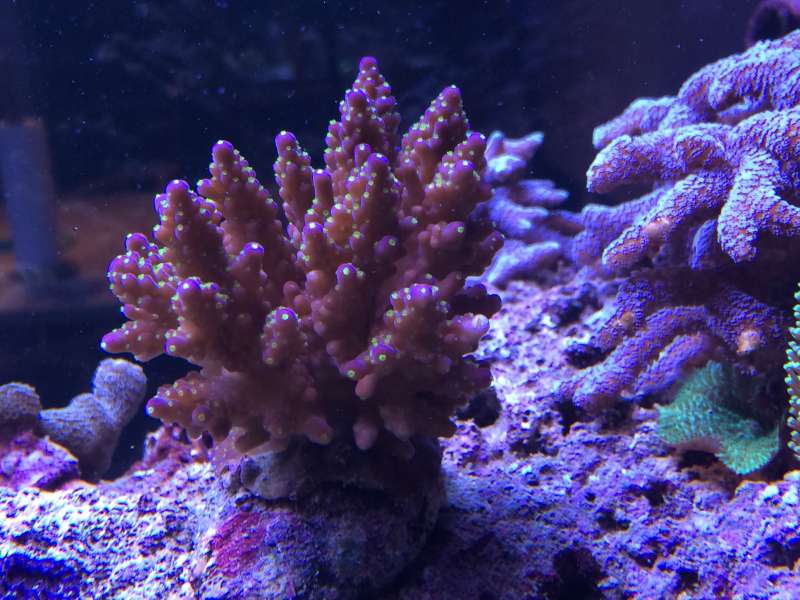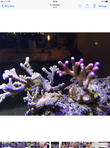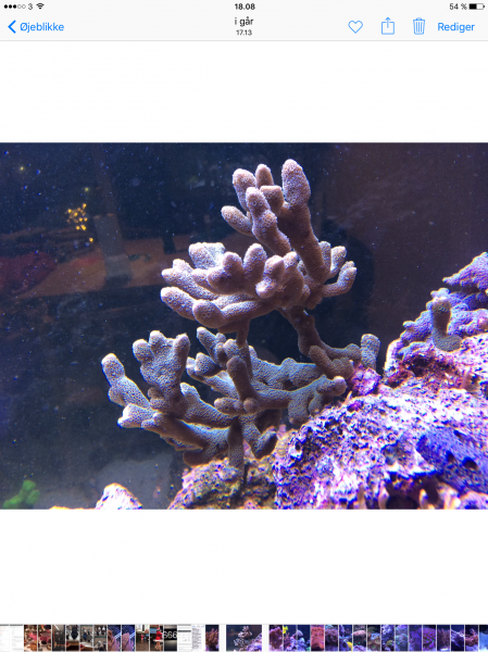 Jeg har den sidste måneders tid kørt med ren T5 lys, hvis du ser lidt tilbage i tråden kan du se at jeg på den konto var ved at brænde alle mine koraller af, da jeg ikke liiiige havde tænkt på den massive PAR de giver og ikke havde skruet ned for lys tiden. Pt køre jeg 5 timer med 6 rør og så 2 rør sol op/ned. Jeg skruer langsomt lidt op for tiden på de 6 rør.