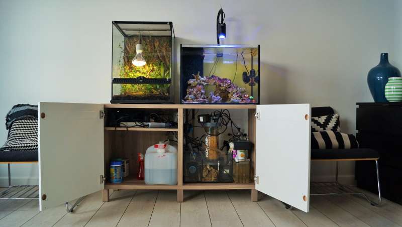 Osmolator: Tunze Nano og bruger min gamle 20 liters CA tank til osmosevand som står i skabet ved siden af.