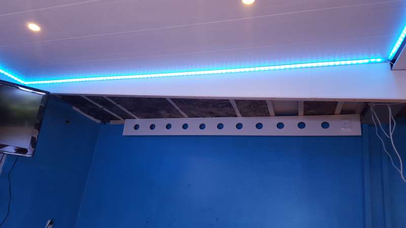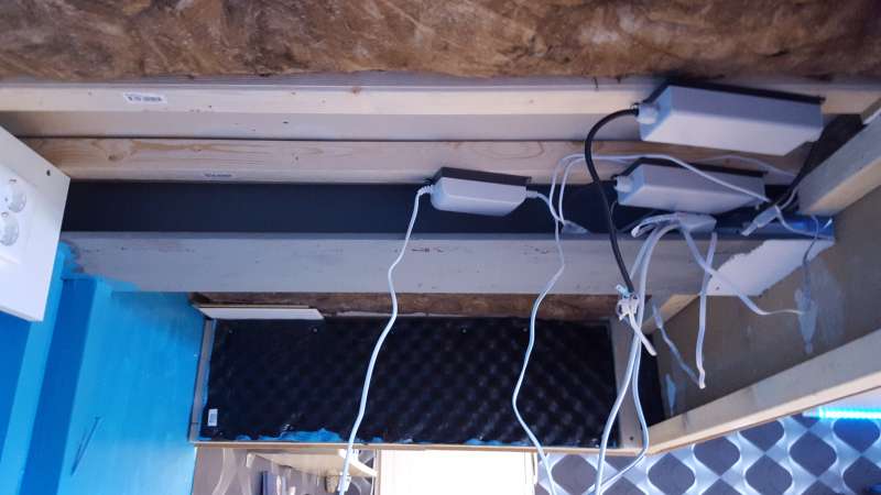 Ledningerne er fra LED listen jeg har rundt i hele loftet (se herunder) her ser man også selve toppen af "låget". Disse skal naturligvis skjules efter alle kunstens regler, nu man skal gøre det ordentligt
