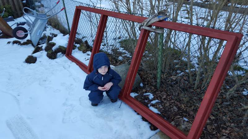 Han var dygtig at borre huller og grunde rammen, den skal males i hvid hammerlak siger min bror (han er sprøjtemaler), så det skal vente til familien er borte i påsken. Gulvet får opgså en blå farve som væggene.