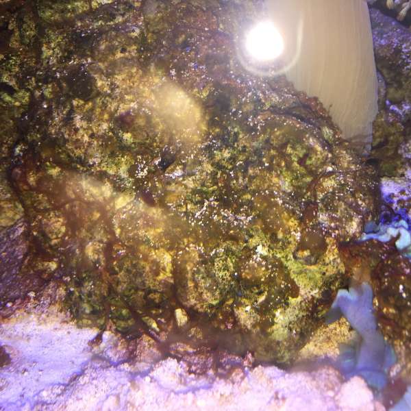 Jeg har nu bøvlet med de her alger i et par måneder, uden der sker nogen fremgang. Jeg har prøvet at blæse sten rene, haft enkelte oppe og vaske, men det kommer igen hurtigt. Slimet brunt stads på sten, pumper og sand. Blege koraller, uden vækst.