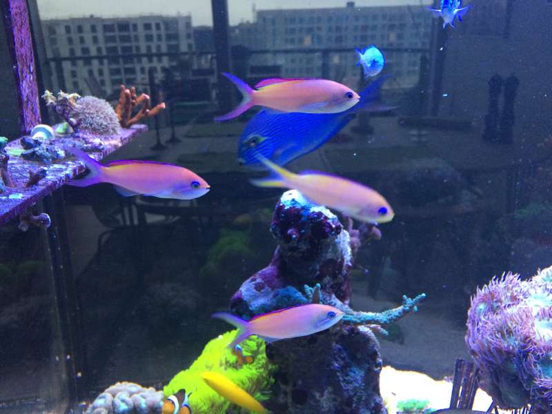 4 anthias Disp. Og en gylte. Skal KLART have lidt flere Anthias :-). Smukke fisk!