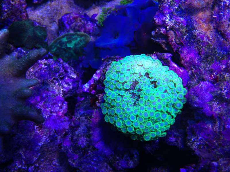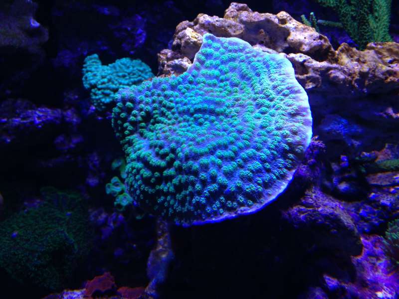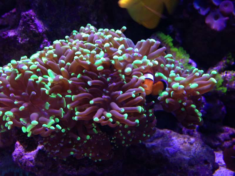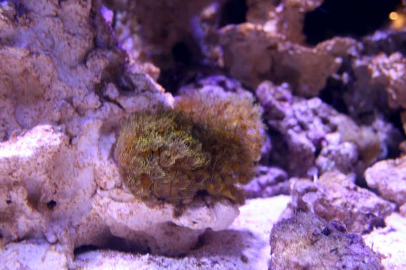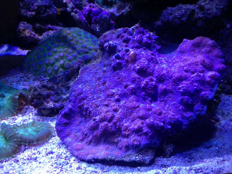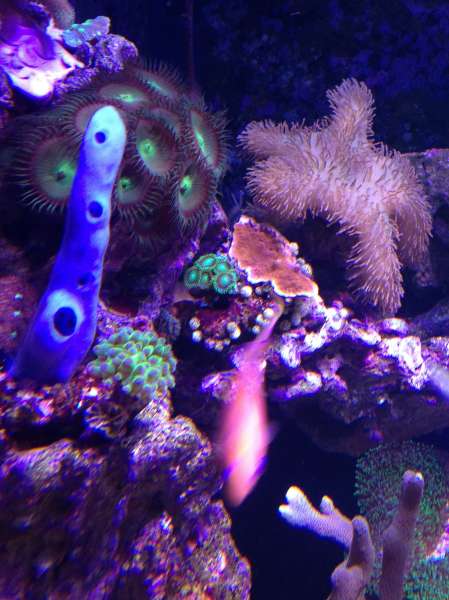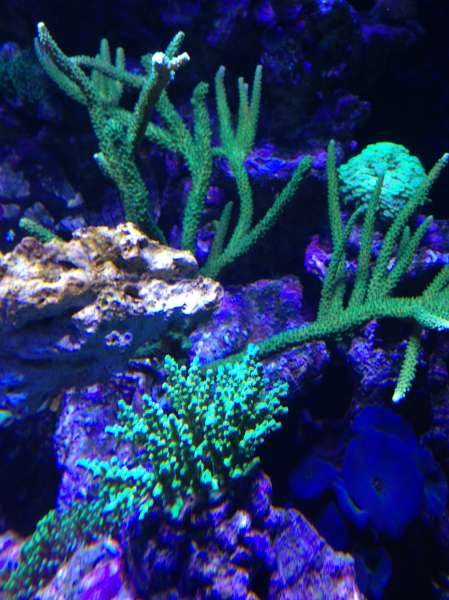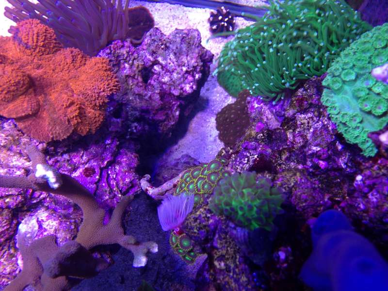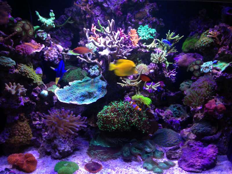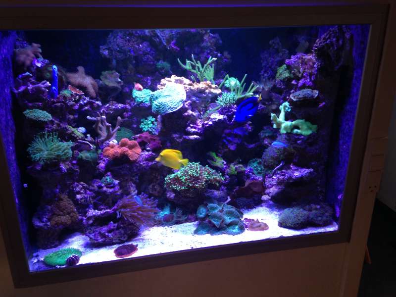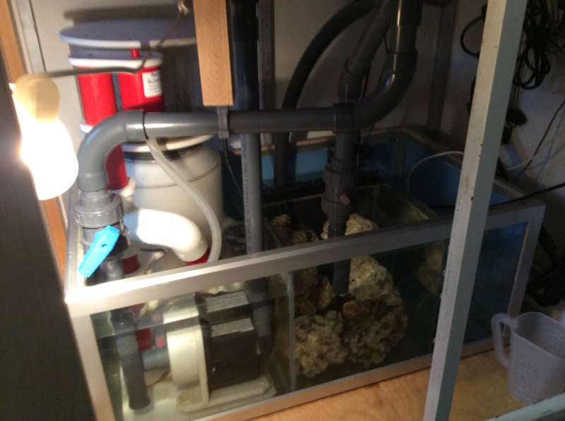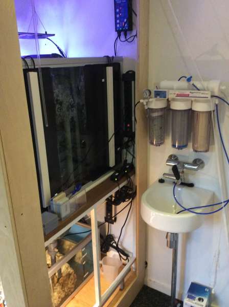 Akvariet er 100 cm bredt, 80 cm dybt og 70 cm højt = 560 L. Som sump har jeg nedenunder et gammelt dyrehandler-akvarie fra Planteimporten på 80x50x35 = 140 l. Sumpen er indrettet med skummerrum, refugie, returrum og ferskvandskammer. Det meste af vandet løber til skummeren, en smule i refugiet og det hele bliver sendt retur af en Red Dragon 6500.