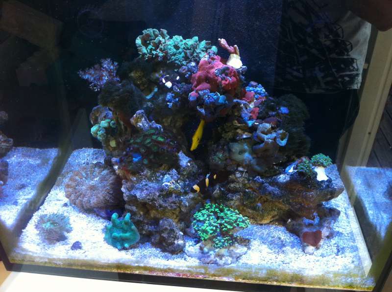UPDATE: Jeg har udskiftet klovnene med et par gold stripe maroons (premnas epigramma). Der er også kommet en gul kirurg i systemet, som jeg dog tror er lidt for stor, selv om den nu er begyndt at svømme roligt omkring og græsse alger af sten og glas. Jeg mangler en skummer, så faktisk kører jeg uden skummer lige nu. Egentlig gad jeg godt fortsætte på den måde, men det vil så kræve en anden form for næringseksport. Jeg gider ikke ATS. Det tager tid at lave, bruger mere strøm end skummeren og så tager den lang tid om at komme ordentligt op at køre. En anden mulighed er et refugium med DSB og en masse alger nede i sumpen. Det kræver også en vis form for lys, men er 100% lydløst, hvilket jo tiltaler mig. Så er spørgsmålet bare om det vil være nok ? Jeg vil ikke have DSB i akvariet, så det bliver kun nede i refugiet, hvis det overhovedet bliver sat i værk. kan nogle byde ind med om det er muligt? Og i så falt, hvilke fisk jeg kan have i akvariet uden at overbelaste systemet, så det ender i alger og andet skidt.