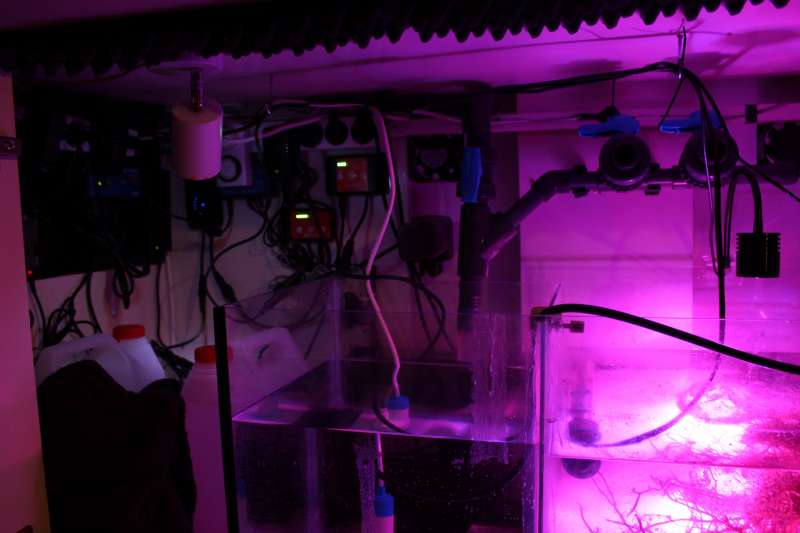 Sump: ca. 200L inddelt med 4 rum: 50-60L skummerrum, 65-70L planlagt til at være refugium, 15-20L returkammer og 35L ferskvandskammer + en bubbletrap