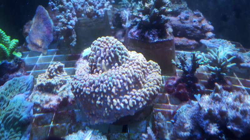 Jeg kører BB så derfor står min på en frag-disc. Disse disc´s øges så i størrelse med større og større diameter. Det giver korallen et lidt pyramide-agtigt udseende, efterhånden som den vokser. Når den fragmenteres skæres der enten i disc´en eller i det der vokser ud i det frie vand. Jeg fragmenterer altid med en Dremmel. Jeg har ikke prøvet at klippe i den med en saks eller tang.