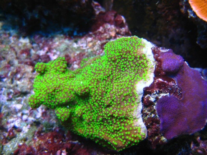 Da jeg har en del fragmenter, så har jeg eksperimenteret lidt med lysforholdene. Jeg har læst en teori om, at den øgede lysmængde skulle gøre at de grønne flouriserende proteiner bliver mere fremtrædende. Derved vil der blive mere grønt i korallen.