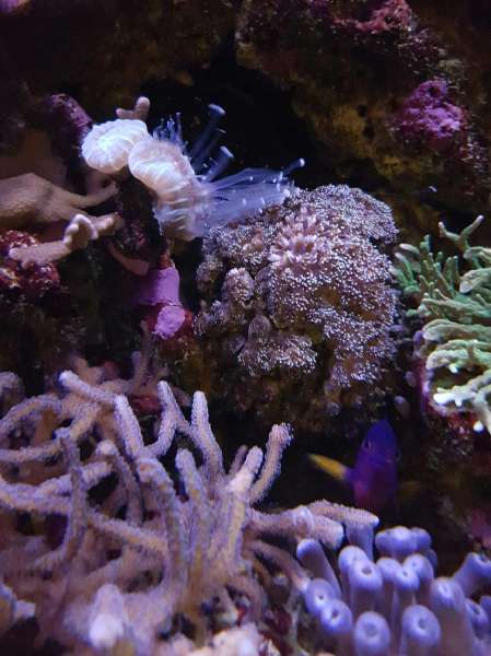 Jeg havde godt lagt mærke til min Galaxea havde nogle få polypper som så skidt ud, men troede det måske var en søstjerne (asteria) eller lignende. Så så her til morgen at min caulastrea (hedder den ikke det) havde disse vildt lange polypper hængende ude. Det var få minutter efter lyset blev tændt så det foregår sikkert i nattens mørke.