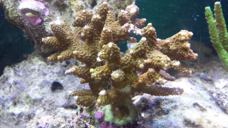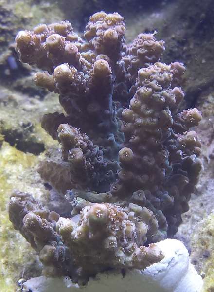 Den sidste er en fin koral, der har grønne grene og røde ender på grenene. Jeg har haft den af flere omgange og har mistet den hver gang. Jeg synes den er svær. De tykgrenede typer vokser ret langsomt og kan se ud som om der intet sker i laaang tid.