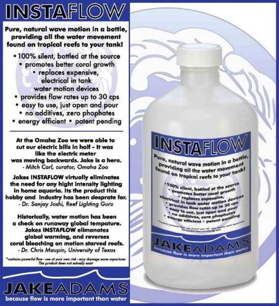 For nogle år siden lavede Rich. Ross, (forfatteren til en række artikler om det at være en ” kristisk reefer”) sammen med en god ven, en annonce om et nyt produkt. Det var ment som en aprilsnar og var en joke beregnet på Jake Adams (en anden velkendt reefer) der mente, at flow var vigtigere end vand. Flow på flaske … De havde fået flere kapaciteter med på spøgen. De er angiveligt bagmænd til de rosende beskrivelser af produktets fortræffeligheder der står på flasken. De havde også designet en etiket.