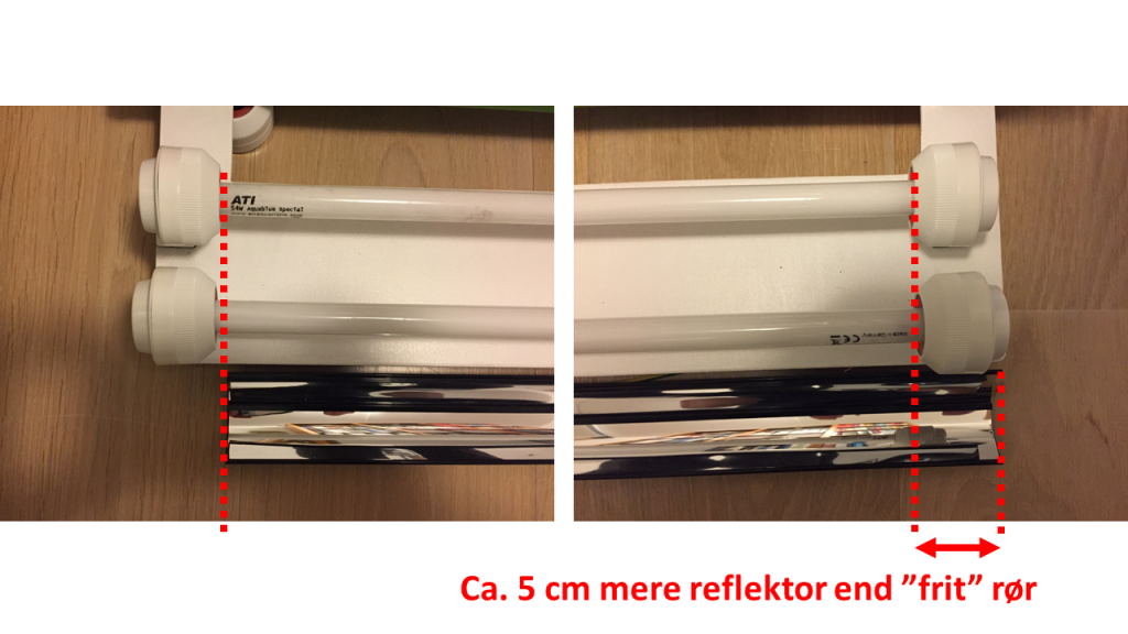 Tak for svarene! Jeg ender på at køre uden dækglas - så må jeg tørre dem af samt udskifte reflektorer lidt oftere. Grunden er, at jeg laver en hybrid-lampe med MaxSpect i midten (se tegning) - så hvis jeg skal lave et lukke system med luft langs rørene, så skal jeg enten have 2 lag glas ekstra i "mellemrummene" til MaxSpect'en, eller lave en kæmpekasse rundt om det hele :BA (og igen, reflektorerne koster 100 spænd per styk)