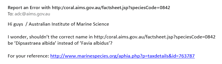 Lidt underligt for Australian Institute of Marine Science, skulle da være førende i verden med korallerPoulD skrev:World Register of Marine Species. (aim to provide the most authoritative list of names of all marine species globally) http://www.marinespecies.org/about.php" onclick="window.open(this.href);return false;Carsten skrev:Worms??PoulD skrev:Enig, det er meget "mudret" - i hvert fald for Favia - (det Favia navn du linker til er i øvrigt ikke accepteret af WoRMS.