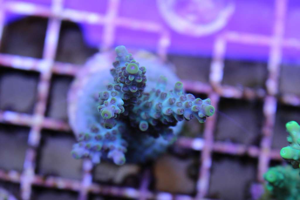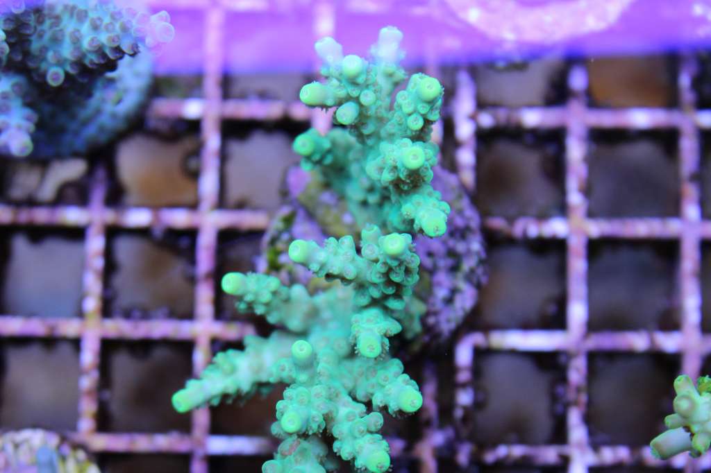 Spændene udvikling. Her er korallen fragmentet er fra. Super flot koral, meget lys grøn tæt på gul, med lys hud imellem polypperne som er mere lys grønne.