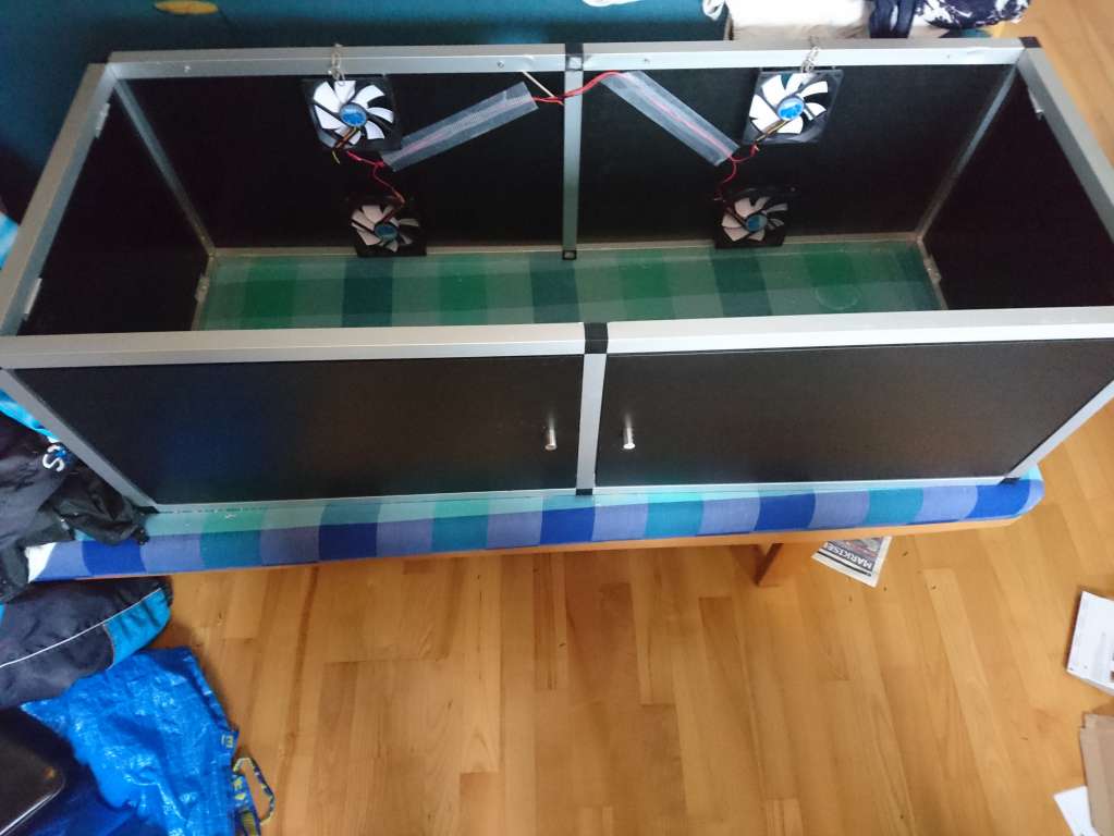 Set ovenfra ser armaturet således ud med de ekstra køleplader. Her ses armaturet nedefra. Har fået monteret linser og acrylplace. Linserne er en blanding af 60, 90 og 120 grader. For de blå og hvide LED er der flest 60 graders linser, da der er mange af dem, for de mere "exotiske" farver som grøn, gul og rød er der brugt 120 grader for at sprede lyset lidt mere. Og så er der hele kontrol delen med arduino og drivere. Havde egentlig regnet med at have det hele i én og samme kasse, men måtte desværre flytte driverne ud på en alu-skinne, da det blev for varmt i en lukket kasse med alle 318W kørende. De mange drivere er for at kunne styre de forskellige grupper seperat, så jeg nemt kan styre hvor meget lys der skal være. Arduinoen er konfigureret således at den har 10 output ben som styrer hver en relæ. Dette kan så tænde for en hel gruppe af LED via driverne. Desværre kan jeg ikke "Dimme" da dette ville blive en langt dyrere løsning. Derimod har jeg lavet nogle ret små grupper helt ned på 6 LEDs så jeg kan lave eret svagt lys. Endelig har jeg lavet en lyskasse af et gammelt porsa understel. Her har jeg monteret 4 stk 12cm blæsere til at køle lidt ekstra, hvis det bliver nødvendigt. Jeg har valgt store blæsere for at kunne køre dem ved lav hastighed og derved få dem helt lydløse. Blæserne kan naturligvis styres fra arduinoen. Så mangler jeg bare at tage et billede af hele herligheden monteret på mit akvarie..... Det må jeg gøre i aften, når der er stille i huset. I må pænt vente så længe