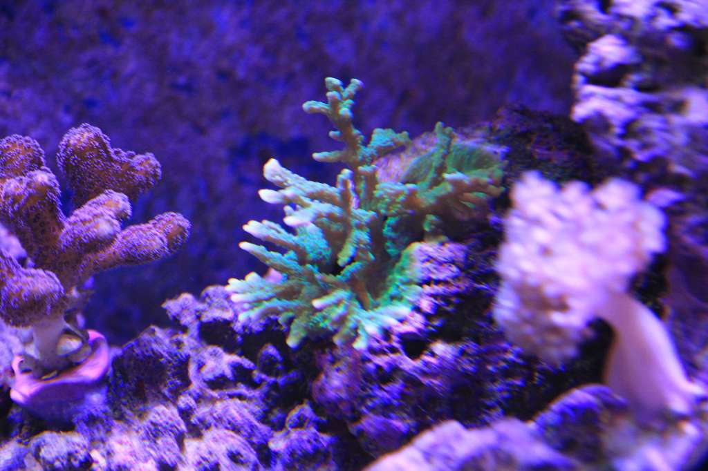 I dag ser akvariet således ud: Og her billeder af lidt udvalgte koraller: Planen er at jeg hen over vinteren vil finde lidt flere SPS'er til toppen af akvariet og nogle zoa'er til venstre side. Så hvis nogen af jeg fantastiske saltvandsfolk har nogle frags i vil af med hører jeg gerne fra jer.