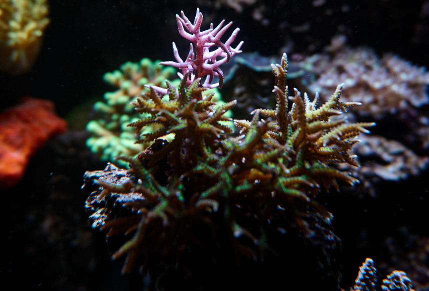 Kiggede du på vores baljer, kunne man godt få en ide om at toppen af et rev burde være helt domineret af blå koraller.