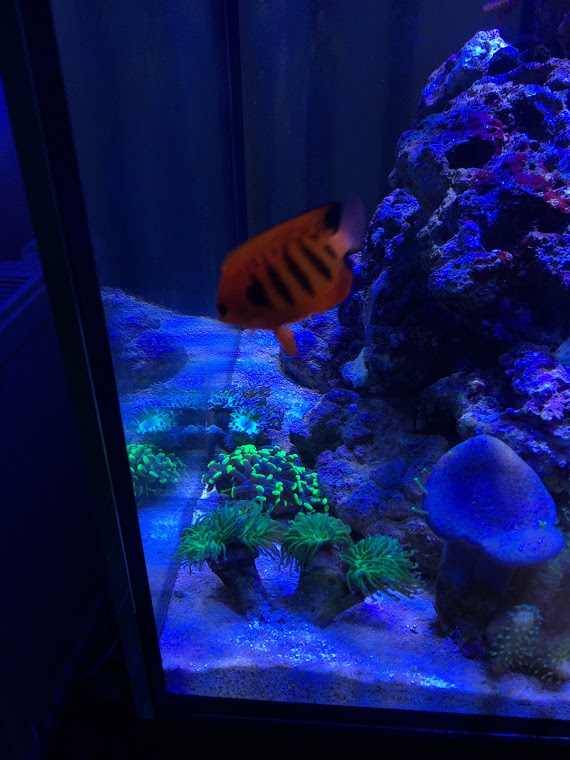 Nedenunder kommer lige et billede af alle beboer med gæller! 2 klovne, en flamme kejser og en bispinosa. Var meget spændt på introduktionen af to kejsere til samme system, men det gik heldigvis meget fint! Sørgede for at de var omkring samme størrelse og så blev de ellers sluppet løs samtidigt.