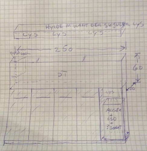 Hylden bliver nok lavet af de der “skærebræt-nylon-sten” Carsten her liggende. Der laves lidt flere huller i disse. Tænker de skal ligges oven på en “rigtig” hylde, lavet af eggcrate, ell andet. Denne hyldes ligges og limes på en lille glas kant langs bagvæg og langs overløb. Hertil skal der bruges en sten som hyldeknægt der sidder oven på hylden og limes på hylden og på bagvæg af baljen. Sidst, hvis det ikke kan bære vil jeg lade stenene gå til bunden til højre ud midt i baljen ( Det vil jeg gerne undgå).... Når hylden er stabil, er det jo “bare” at lægge lidt sten oven på denne og lime på kant, så eggcrate ikke kan ses og også lave et par små hylder på baggrunden, så køre det.....vil super gerne have en illusion af et det hele “hænger” og kommer oppe fra.... håber det giver mening?