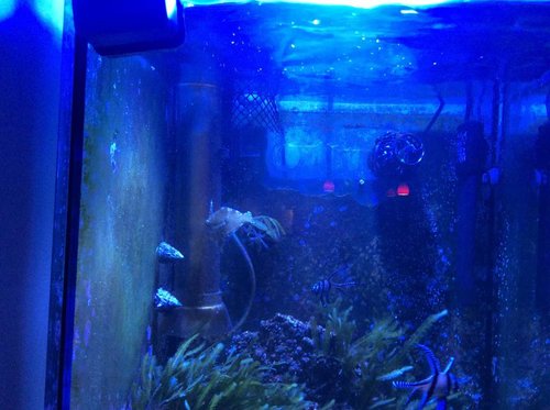 Blå baggrund og så Ikeas små led strips bag akvariet (dem der kan skifte farve) så kan jeg se hvilke farve der passer bedst.