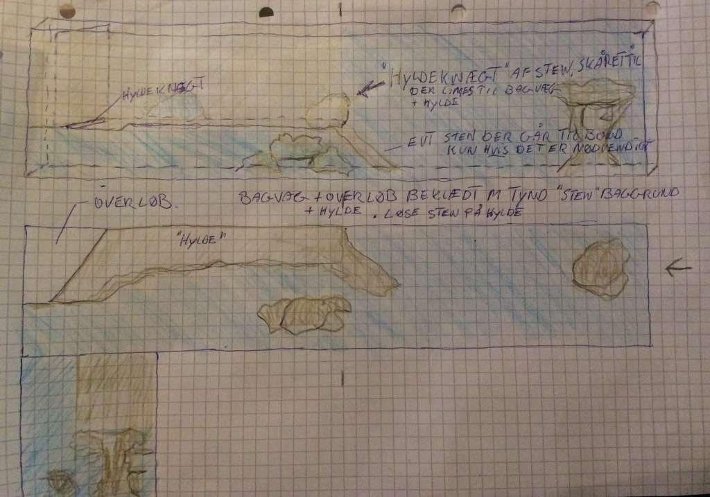 Hylden bliver nok lavet af de der “skærebræt-nylon-sten” Carsten her liggende. Der laves lidt flere huller i disse. Tænker de skal ligges oven på en “rigtig” hylde, lavet af eggcrate, ell andet. Denne hyldes ligges og limes på en lille glas kant langs bagvæg og langs overløb. Hertil skal der bruges en sten som hyldeknægt der sidder oven på hylden og limes på hylden og på bagvæg af baljen. Sidst, hvis det ikke kan bære vil jeg lade stenene gå til bunden til højre ud midt i baljen ( Det vil jeg gerne undgå).... Når hylden er stabil, er det jo “bare” at lægge lidt sten oven på denne og lime på kant, så eggcrate ikke kan ses og også lave et par små hylder på baggrunden, så køre det.....vil super gerne have en illusion af et det hele “hænger” og kommer oppe fra.... håber det giver mening?
