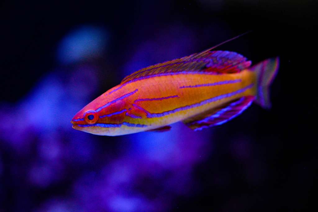 Og så vores største fisk, et rigtigt pragteksemplar, nemlig en Flasher gylte han. Sindssygt smuk i farverne og er altid fremme i akvariet, hvilket er super skønt da Wetmorellaen som ellers er ret sky, er begyndt at bevæge sig mere ud i akvariet.