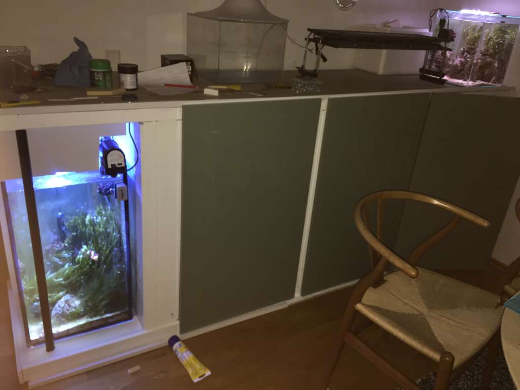 Der skal laves inddækning ved den lille balje i hjørnet (Apex foder automat osv flyttes senere), inddækning når den store balje er kommet osv. Akvariet kommer næsten til at gå op til hvor hylderne nu hænger ;-)