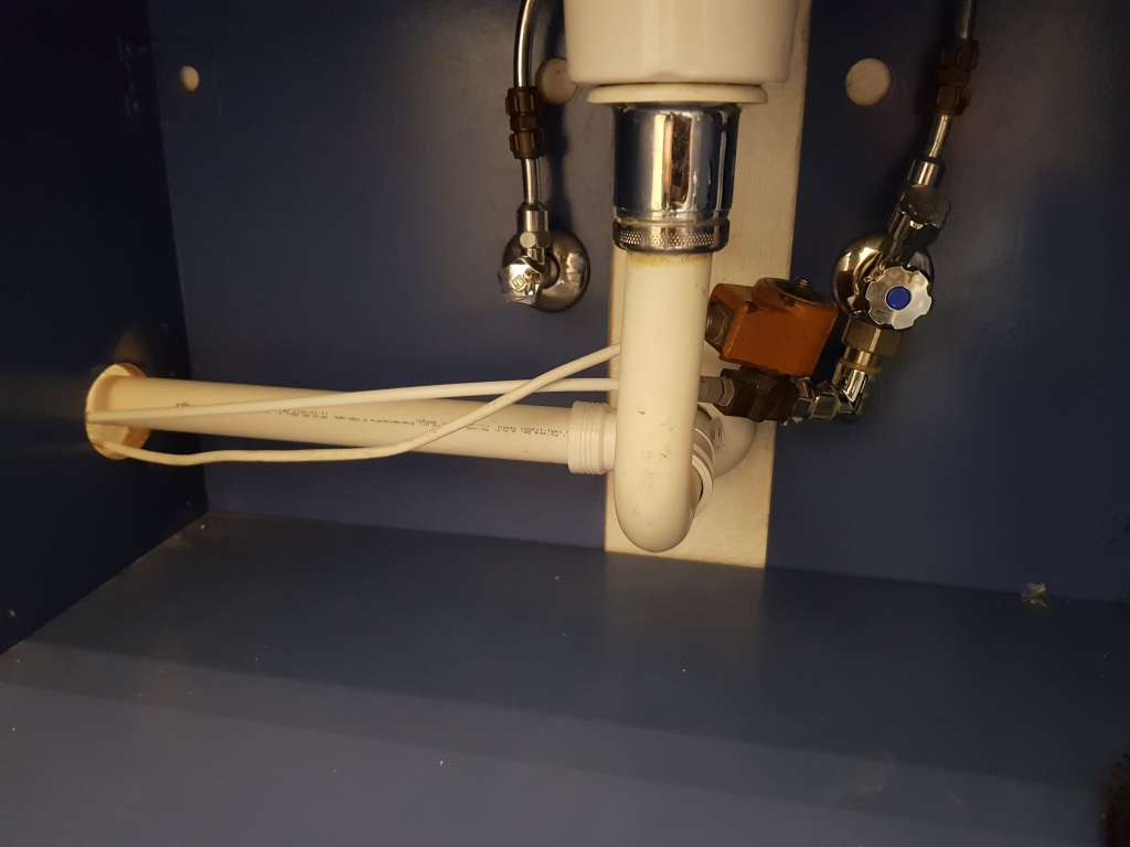 inde i skabet er der lavet afløb og vand til vandskift og osmose anlægget. og der kommer en udsugning i væggen til at trække fugt ud af skabet, så det ikke ender i stuen.