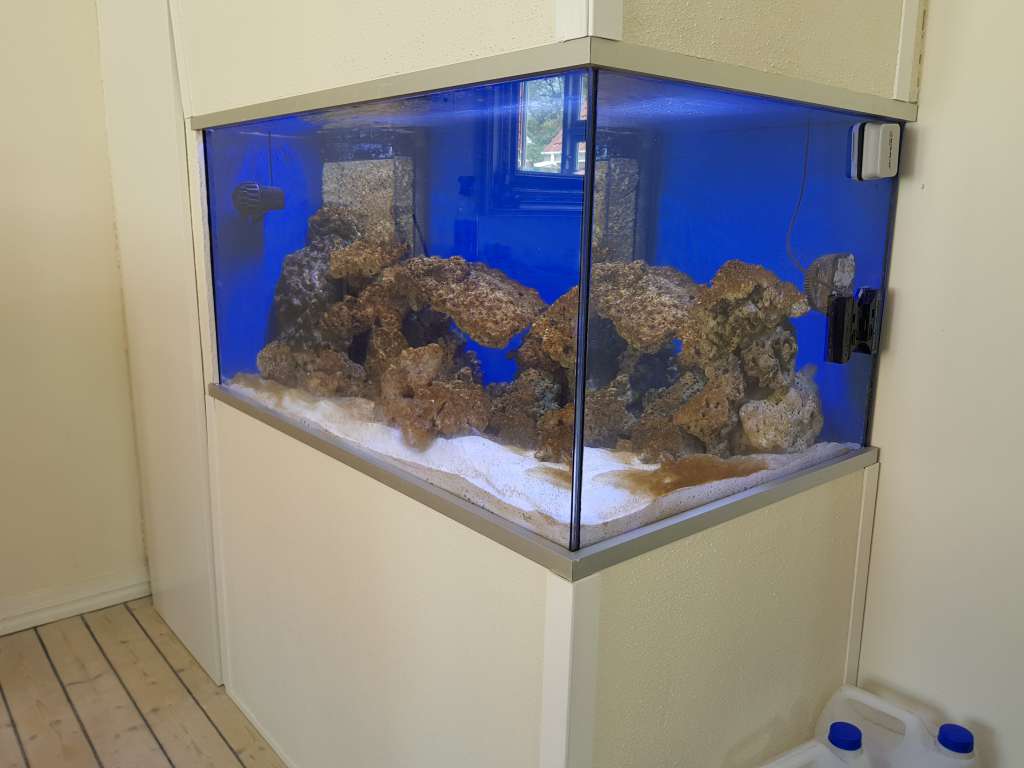 er startet op med 48 kg tørre sten, og 11 kg indkørte sten, 20 kg Live Reef Base Pink til bundlag