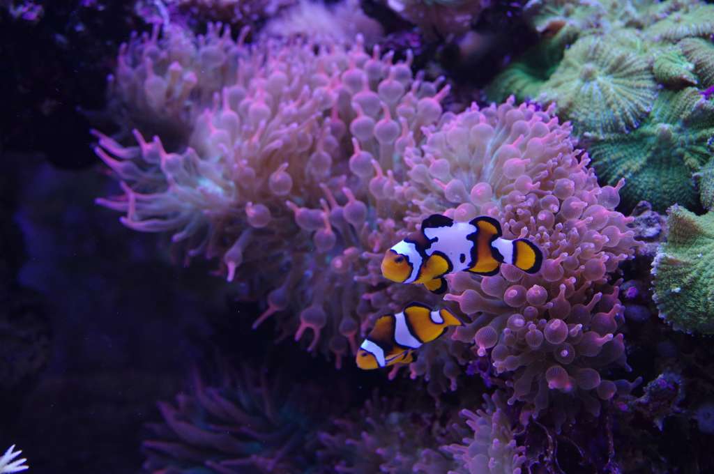 Jeg har taget nogle billeder af akvariet som det ser ud nu. Jeg har problemer med for mange bubbeltip anemoner, og de brænder de andre koraller væk. De er umulige at fjerne, fordi deres fod er langt inde i hullerne mellem stenene, men på den anden side bliver klovnfiskene glade for dem, når de engang er store nok til at blive flyttet over.