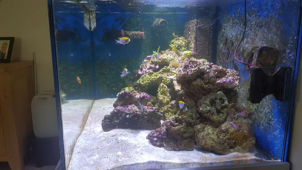 er startet op med 48 kg tørre sten, og 11 kg indkørte sten, 20 kg Live Reef Base Pink til bundlag