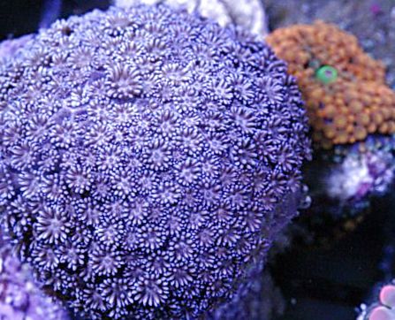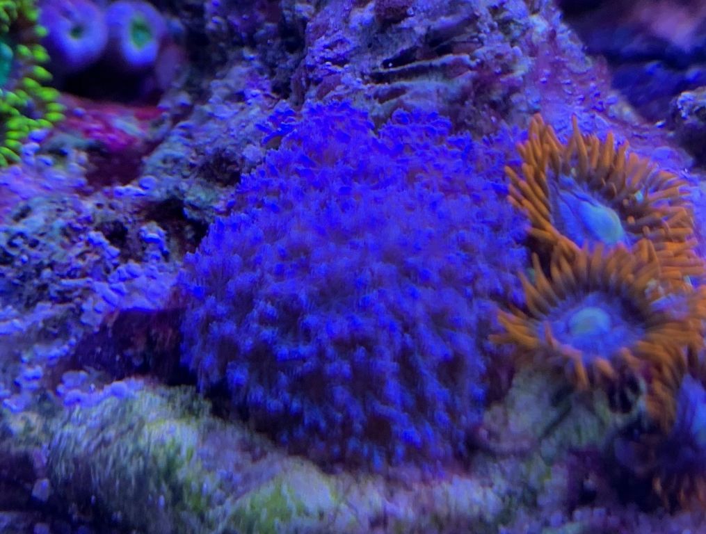 Jeg har det her lilla gras eller små blomster. det gror flere steder bland Polyp, og på sten. Det jeg selv har fundet, og det der liner mest så er det en lilla Urtepotte Coral (Goniopora) Men syntes heller ikke det liner rigtig.