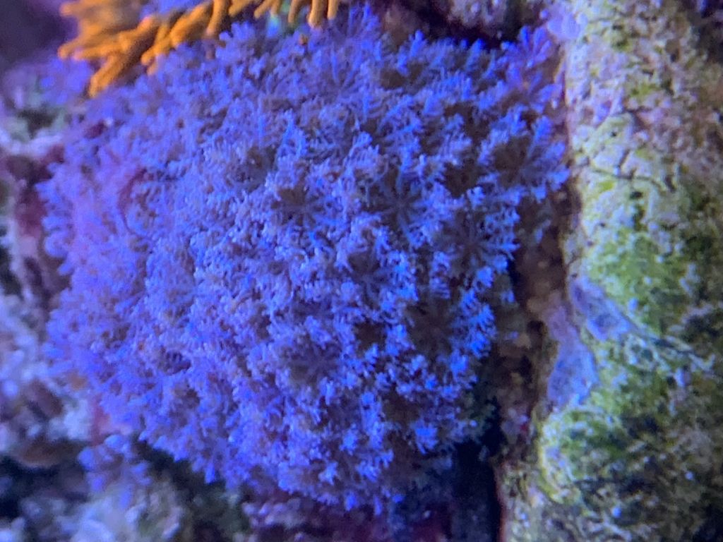 Det kan være mange ting. Som skrevet kan det være en Clavularia, men lige så let en Anthelia, og mange andre. Hvordan ser bunden ud. Er det små rør eller kommer polypperne direkte ud fra bunden?