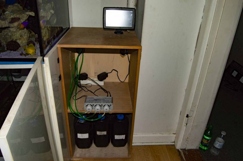 Så fik jeg taget mig sammen, til at flytte min Aquatronic akvariecomputer, fra det gamle akvarie og over på det her, der skulle jo helst ikke ryge nogle koraller i flytningen, det tror nu ikke der går, for det hele står snor lige, alle SPS´er har god polyp udfoldelse, og alle LPS´er er godt pustet op. Jeg fik os taget mig sammen, til at ryde op ved sumpen, så der ikke er et lednings helvede dernede.