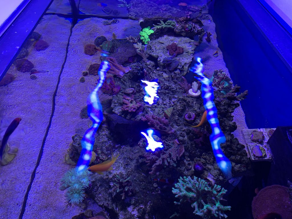 ikke et eneste tab, og jeg kan se tydeligt at min sour apple favia, og et af mine acropora frags, har vokset ud over deres plugs. og har mere polyp udfoldelse på mine acropora end i det gamle akvarie, men de får os et meget bedre flow omkring sig, end de gjorde i det gamle akvarie. synes os jeg kan se bedre farver på korallerne, men ved ikke om det bare er ønske syn/tænkning eller hvad du vil kalde det. de står ihvertfald flot, og har ikke set tegn på, der er nogle af korallerne der ikke har kunne lide flytningen. er lidt imponeret over de har taget det så godt, især når man tænker på akvariet kun har kørt i 9-10 uger nu, og det er startet op på døde LS og sand. og aquaforest bakterier