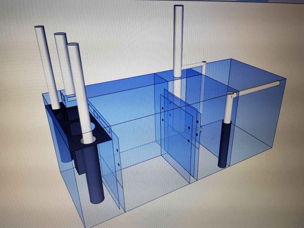 Rørføringen til osmosetanken ( bagerste kammer på langs mellem retur og tilløb) har jeg ikke fået tegnet på endnu. Ligesom jeg heller ikke har fået lagt planerne om hvor jeg skal montere slangeholderen til doseringsmaskinen, men tænkte den del skal side i returkammeret