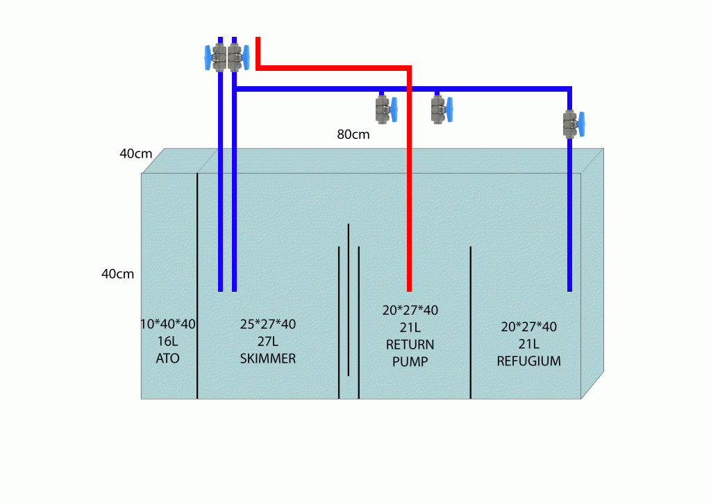 Refugium vil få vand fra nedløb som reguleres. Så en del vil gå til skummer og en del til refugium afhængig af hanerne som åbnes og lukkes. (Det er tanken) :happy: