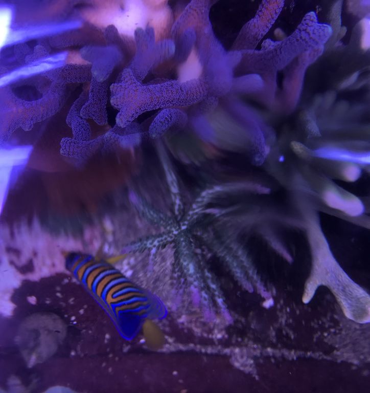 Imperator er så småt begyndt at vise tegn på farveskift, rygfinnen bliver mere og mere hvid og de “neon” blå cirkler er aftaget. Den brummer ind i mellem lystigt når den ikke er helt tilfreds, eller vil have mere mad. FED FISK :hehe: Glæder mig til at se den i voksen dragt, gad vide hvor lang tid det tager? Nogle erfaringer ???