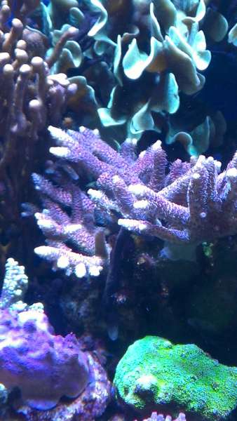 Typer som ”pokerstar”, ”reverse pokerstar”, ”superman”, ”Purple haze”, (?)rød bund røde polypper) og ”Rainbow”, skal have masser af begge dele for at få de flotte farver. Hos mig trives de også længere nede i revet og vokser godt, men kan ikke holde bundfarven. Jeg har ”Purple Haze” stående på en revkant, lige under overfladen og den trives fantastisk. Den stikker oven i købet ovenud jævnligt pga min waveboks, det går ud over de yderste polypper, men resten af korallen trives fint med det – og den holder bundfarven.