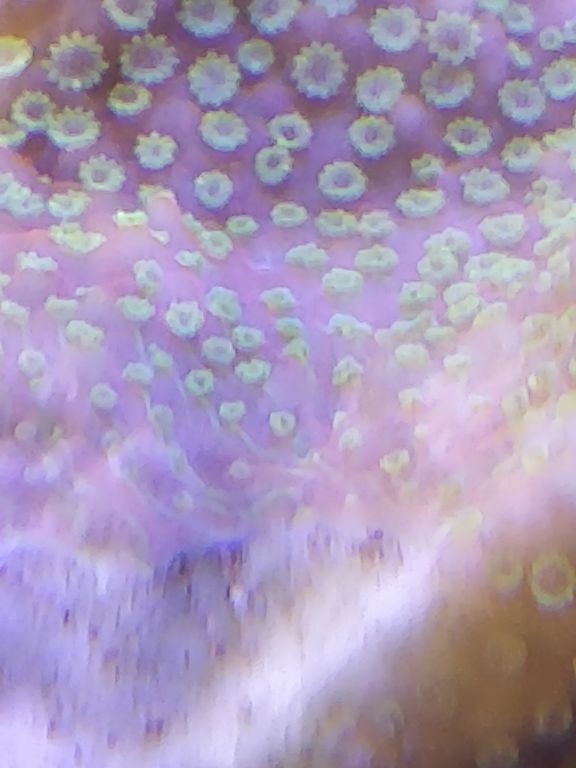Jeg lå første gang mærke til det mistede væv i går morges, jeg tænkte straks at det måtte være RTN, STN, eller Nudibranch, men undrede mig over symptom 3, som jeg ikke umiddelbart har set hos mig selv eller andre før. Jeg havde desværre ikke tid til at gøre noget ved det i går, så lod fragget være. Heldigvis var der ikke forsvundet synligt mere væv i går aftes, og jeg er derfor relativt sikker på at kunne udelukke RTN. For ikke at gøre noget overilet besluttede jeg mig for at lade fragmentet være natten over, og stå op i nat, for at tjekke efter om der var nogle synlige nudibranches - det var der ikke. Her til formiddag er området med vævtab stadig ikke blevet synligt større. Pga. symptom 4, hælder jeg mest til at det skyldes nudibranches, men er ikke helt sikker da jeg ikke har set nogle og pga. symptom 3, som jeg ikke har hørt om før.