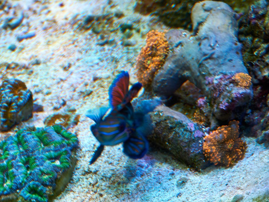 Tror det det så småt er ved at komme på fode igen, omend det stadig ikke er alt der trives lige godt. Fiskene har det godt. Kirurgerne er snart 9 år (Achilles 8½) Dog forsvandt min koralvogter for at halvt års tid siden. Til min overraskelse havde både min mandarin og mine rejer åbenbart været intimideret af den. Tidligere så jeg dem stort set aldrig, nu er de fremme hele tiden. Den ene reje er omtrent snart på størrelse med en caribisk languster. Det er lige før den skubber kirurgerne til side når der fodres. Jeg kan da lige poste et par friske billeder, omend det bliver med snavsede ruder.
