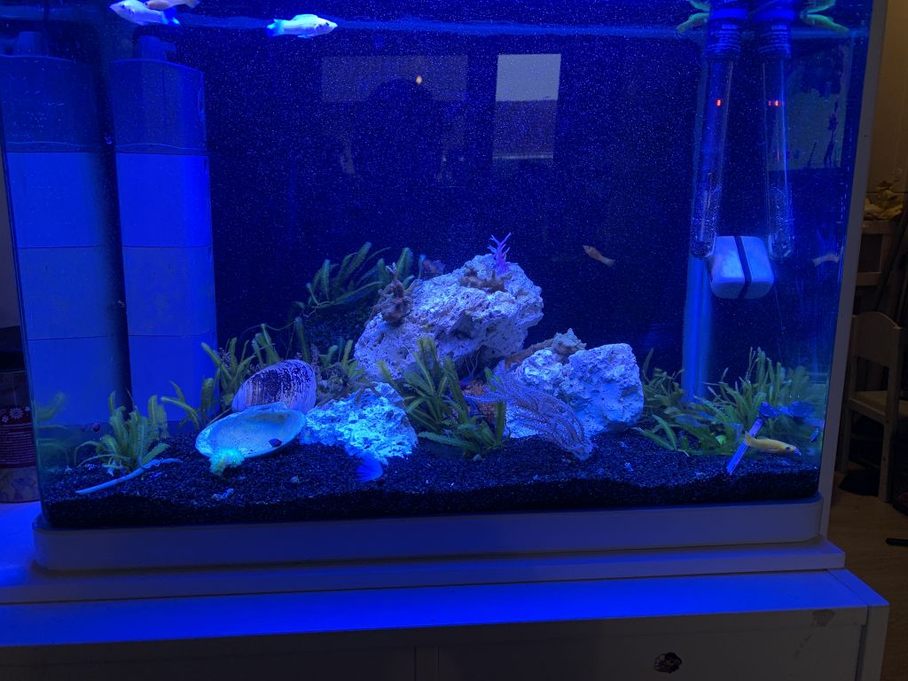 Vi har skiftet vand i ungernes akvarie, der lidt mange micro bobler på billederne men de forsvinder. Vi har talt 5 små “rene” saltvands mollyer.