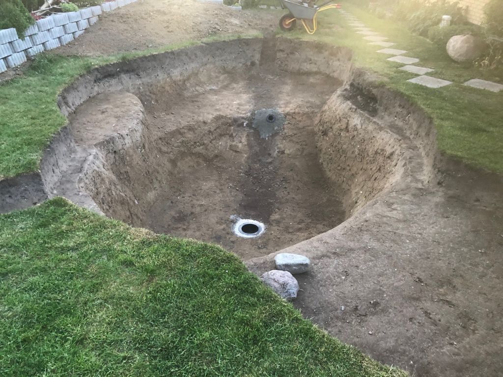 Udgravningen er startet og selve dammen er mere eller mindre kommet på plads :GO mangler også at få gravet ud til en pumpebrønd, kanal hvor rør skal ligge i samt til bunddræn og skimmer. Yderligere skal der også graves en kanal som skal bruges til retur fra filter. Men nu begynder det at tage form i haven :biggrin: