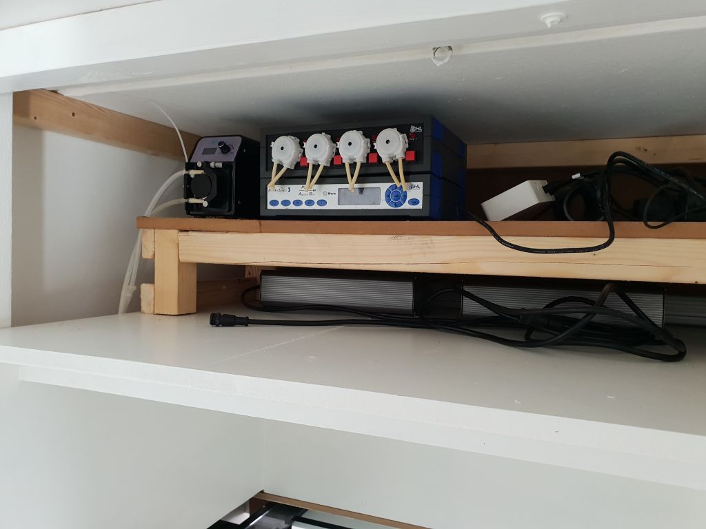 Her ses Kamoer pumpen, samt et GHL profilux 3.1N anlæg, som forhåbentlig bliver skiftet ud med Profilux 4 for at få wifi delen. Men det må tiden vise.