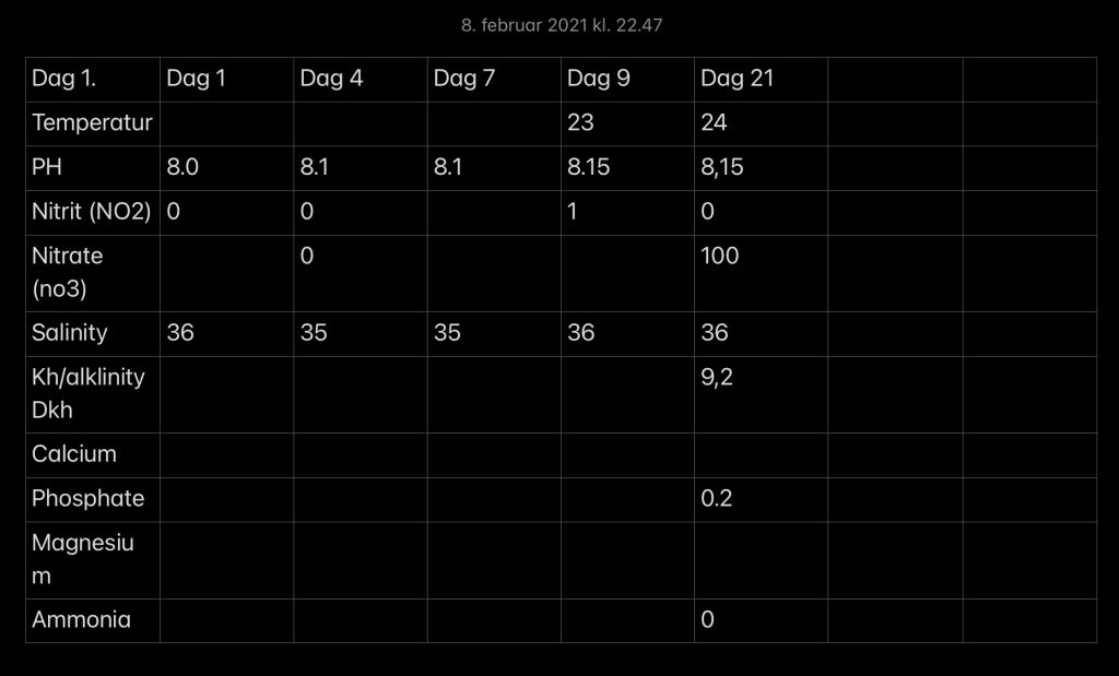 Jeg har her mid januar startet en IM 40g (144l) aio balje op. Og er blevet i tvivl omkring min indkøring. Min problemstilling er at det nu har kørt i 3 uger og jeg ser ikke skyggen af nogen alger. Har målt lidt værdier løbende, men fik først de sidste testkørt jeg havde bestilt her for nylig. Er der begyndt at komme liv? Startede op med 7-8kg døde blandet sten, 9 kg levende sand. Har haft lyset slukket, her den første måned, men har lige tændt det , for at se om det giver en forskel. Da jeg har meget høj nitrat, laver jeg også er vandskifte her nu for at få det ned. Havde planer om at der skulle et par klovne og et lille clean up Crew i her snart, men er det overhovdet klar?