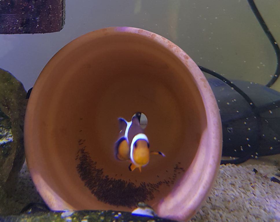 Dette gælder alle mine klovnfisk... klovnfisk kan godt lide at lægge æg på en blank / semi blank overflade, det er hele formålet med at give dem de almindelige terracotta krukker man kan købe i byggemarkedet og andre steder :wink: udover dette giver det dem følelsen af beskyttelse.