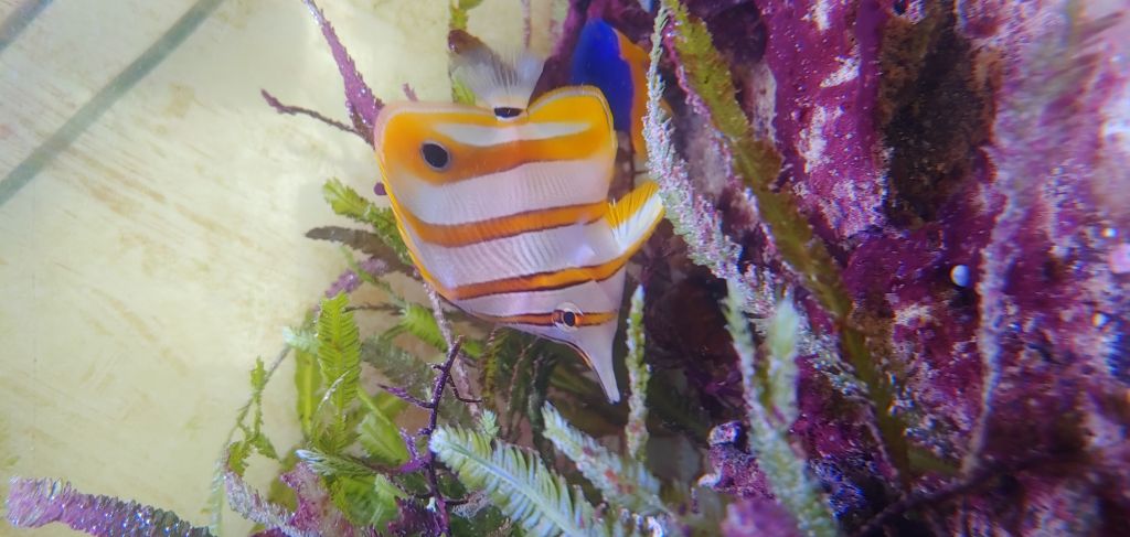 Mit karantæne akvarie er på 128liter, har en lille skummer, varme, en halv gyre pumpe, og 5W UV, ved godt det er meget lille, men kører med lavt flow.
