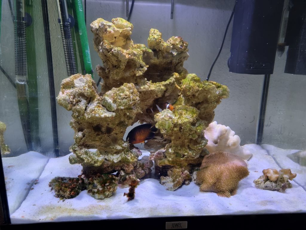 Det er et juwel 120 lido med en tunze 9004 skummer og en stor gammel grå eheim spandpumpe. Lampen er en maxspect 70 w. Der er et par klovne og en coral beauty. Der kommer noget krible kravle snart. Det store juwel bliver til ferskvand med planter